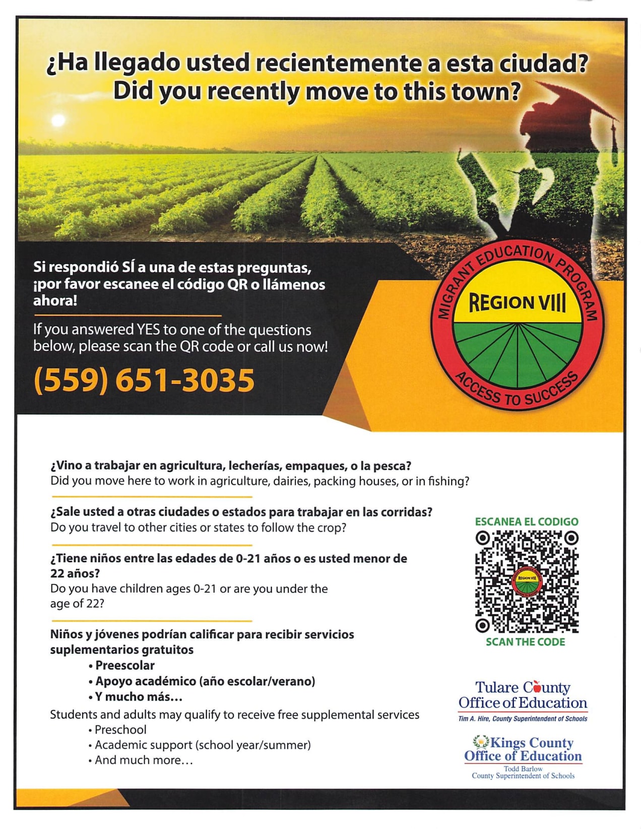 Migrant Education is a national, federally-funded program that provides services to children and youth ages 3 to 21, whose education has been interrupted in the past three years because of the need for migrant parents to relocate to other areas in order to find agricultural or seasonal work. Lemoore Union High School partners with Migrant Region VII to serve migrant students and their families. For more information, please visit the TCOE Migrant Education Program, Region VII webpage.